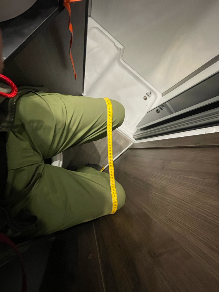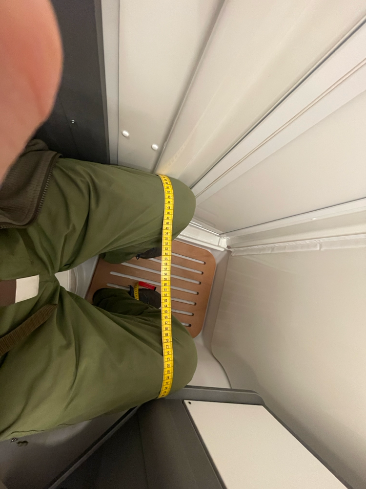 Zum Erlangen von realistischen Werten des benötigten Platzbedarfes, kann man daheim den Abstand der Knie mit dem Metermaß messen. Dann weiß man, wie es sich persönlich ohne räumliche Einschränkung anfühlt und welchen Abstand von Knie zu Knie besteht.