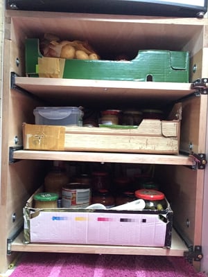 Unterschrank mit den drei Schubladenauszügen befindet sich unterhalb des Kühlschranks.