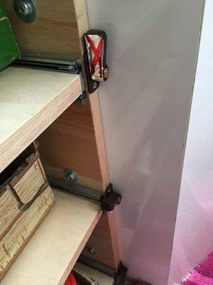 Rechts und links begrenzen die Führungsschienen der Schubladenauszügen mögliche Bewegungungen der PU-Kästen.